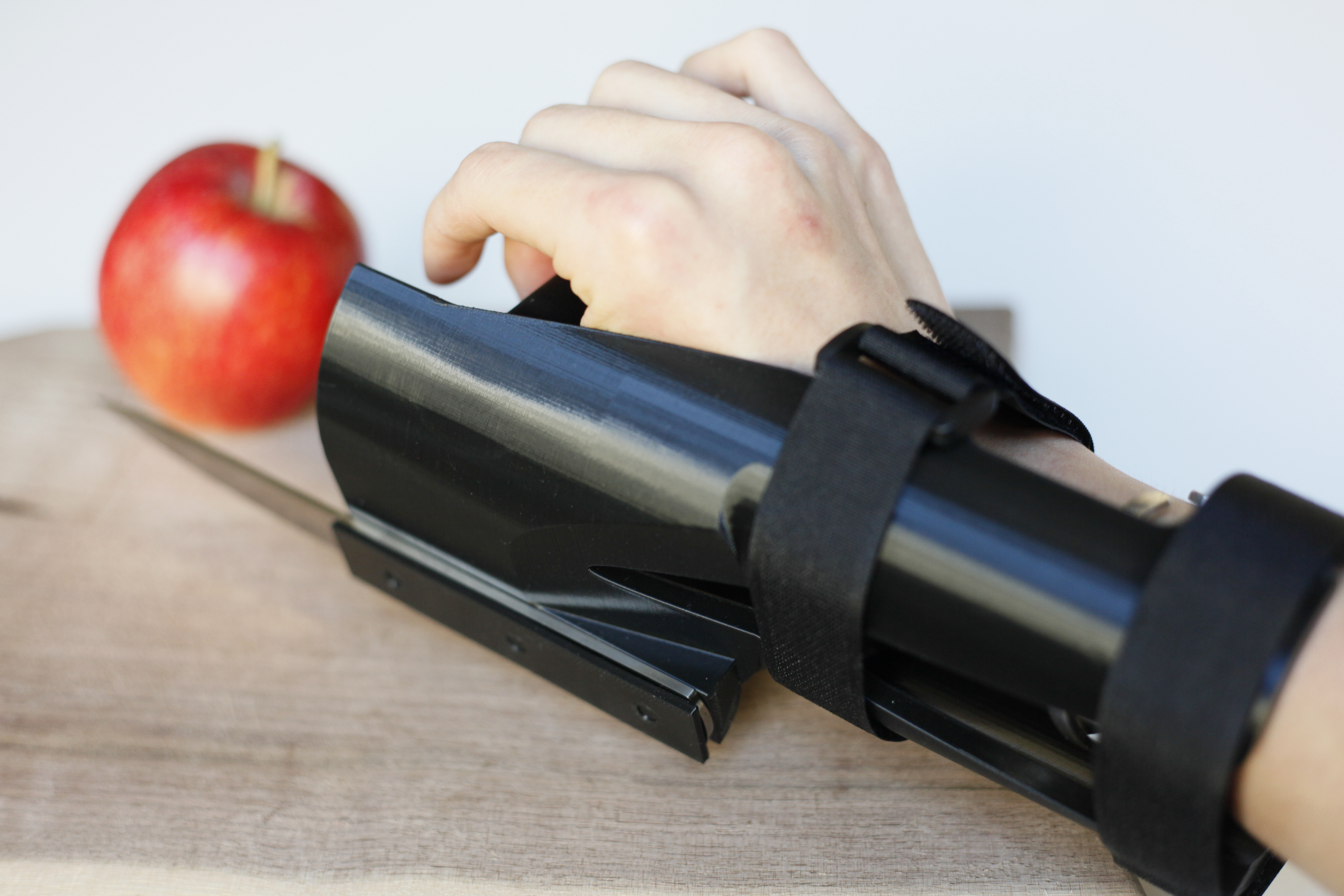 Develop a kitchen knife that supports Austin's independence in cooking, while promoting safety and aesthetics.